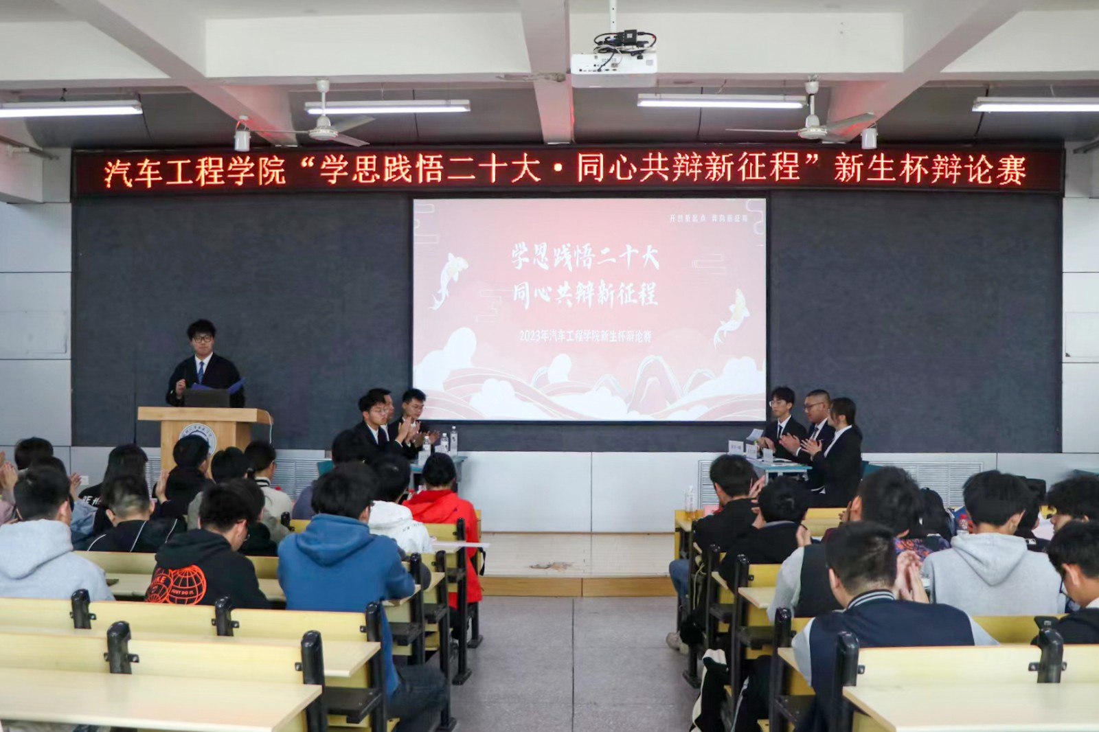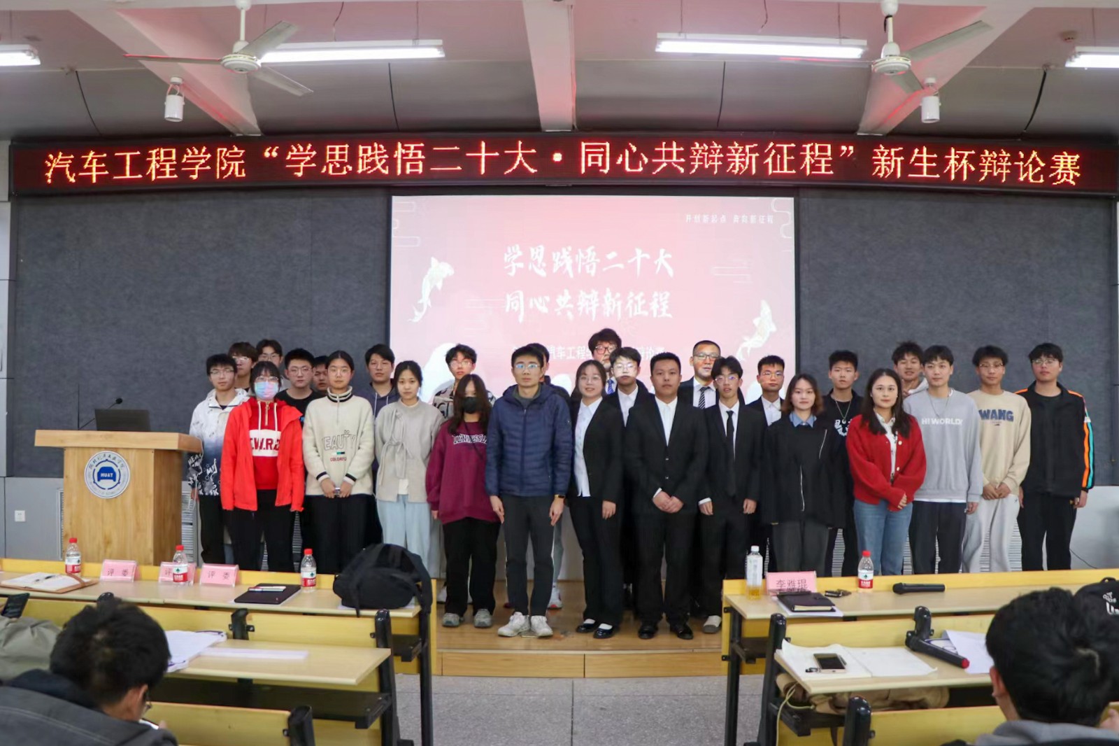 于6113教室开展“学思践悟二十大,同心共辩新征程”新生杯辩论赛决赛。学院分团委书记李雅琨、往届优秀选手以及22级全体成员参加此次活动。活动由新能源汽车211班郑宇轩主持。