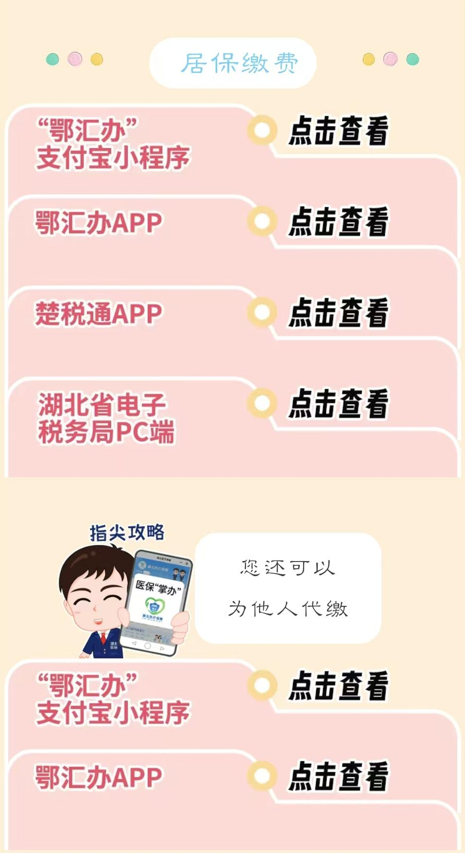 (1)2025年度城乡居民基本医疗保险集中参保缴费时间2024年9月-12月,保险费用一年一缴,保障时间为2025年1月1日-12月31日,入学新生办理完参保登记后可自行在湖北医疗保障微信小程序、鄂汇办APP等渠道缴纳2025年城乡居民基本医疗保险。2025年城乡居民医保个人缴费标准为400元/人每年,具体操作流程可参考微信公众号“湖北医疗保障”推文《@湖北人,城乡居民医保缴费开始啦》;
