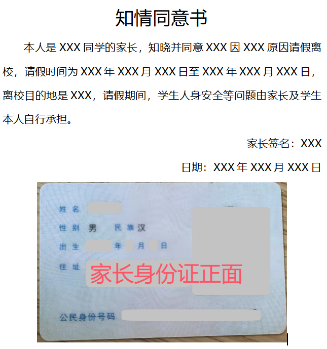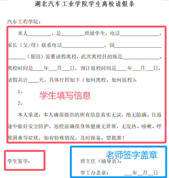 (2)需要离校过夜/离堰时,提供家长知情同意书电子版,在学工办开具纸质版请假条,辅导员/学院领导审核签字盖章有效,如下图;