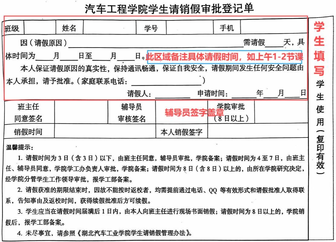 f、开完请假条需要交给因故无法正常上课或参加活动的相关负责老师,如果存在一张请假条覆盖多节课程的情况,出示请假条给第一节课任课老师查阅即可,自行保留至下一节请假课程备用。