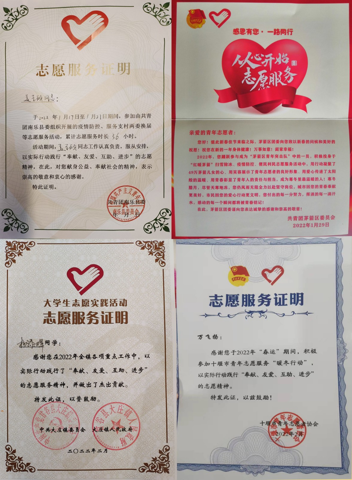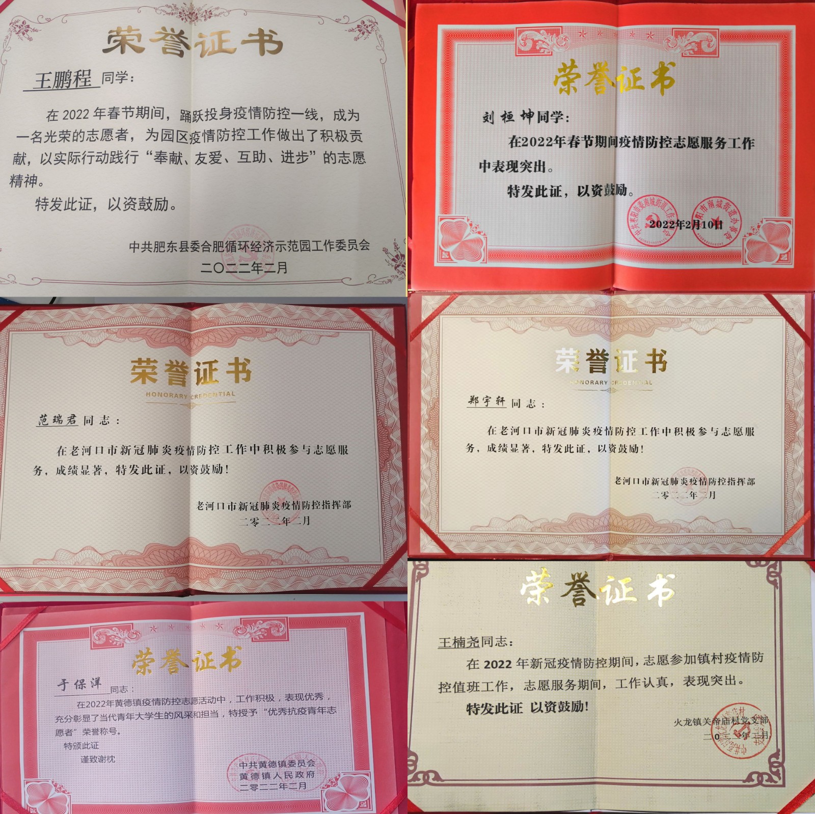 近日,麻豆在线 收到十堰市青年志愿者协会、湖北老河口市防疫指挥部、广西梧州市藤县宁康乡料南村委会等多地发来的表彰证书与感谢信。信中对我院车辆216班庞佳兴、万飞扬;车辆212班于保洋、范瑞君;车辆213孟子硕、黄洪涛、杨添晖等多名同学在家乡疫情防控服务工作中的突出表现表示高度认可和衷心感谢。