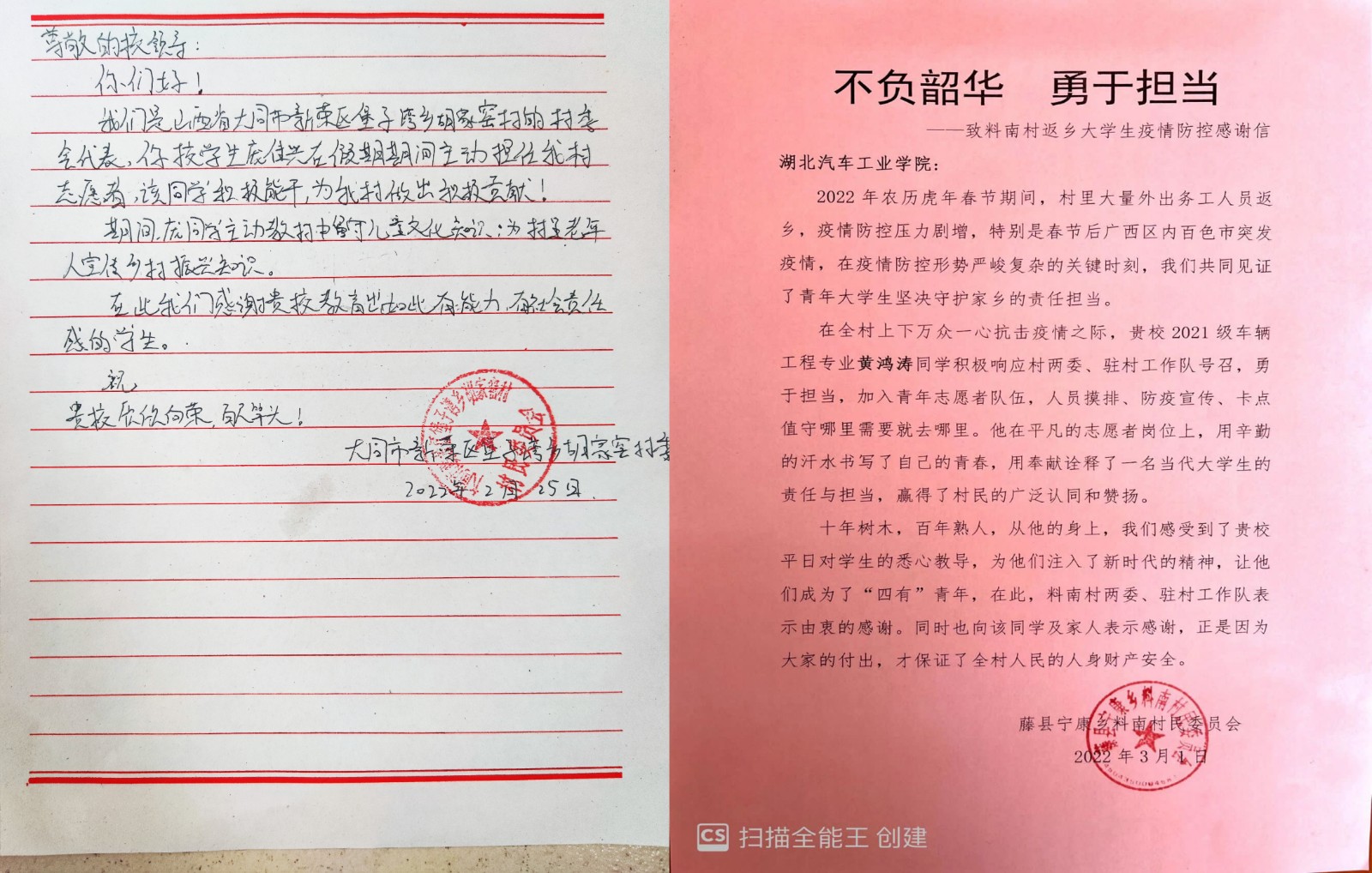 广西梧州市藤县宁康乡料南村委会在信中写道:“黄洪涛同学积极响应村两委驻村工作队号召,勇于担当,加入青年志愿者队伍,帮助村委开展人员摸排、防疫宣传、卡点值守等任务,工作风雨无阻,认真负责。在平凡的岗位上,用辛劳的汗水书写了自己的青春,诠释了一名当代大学生的责任与担当。”