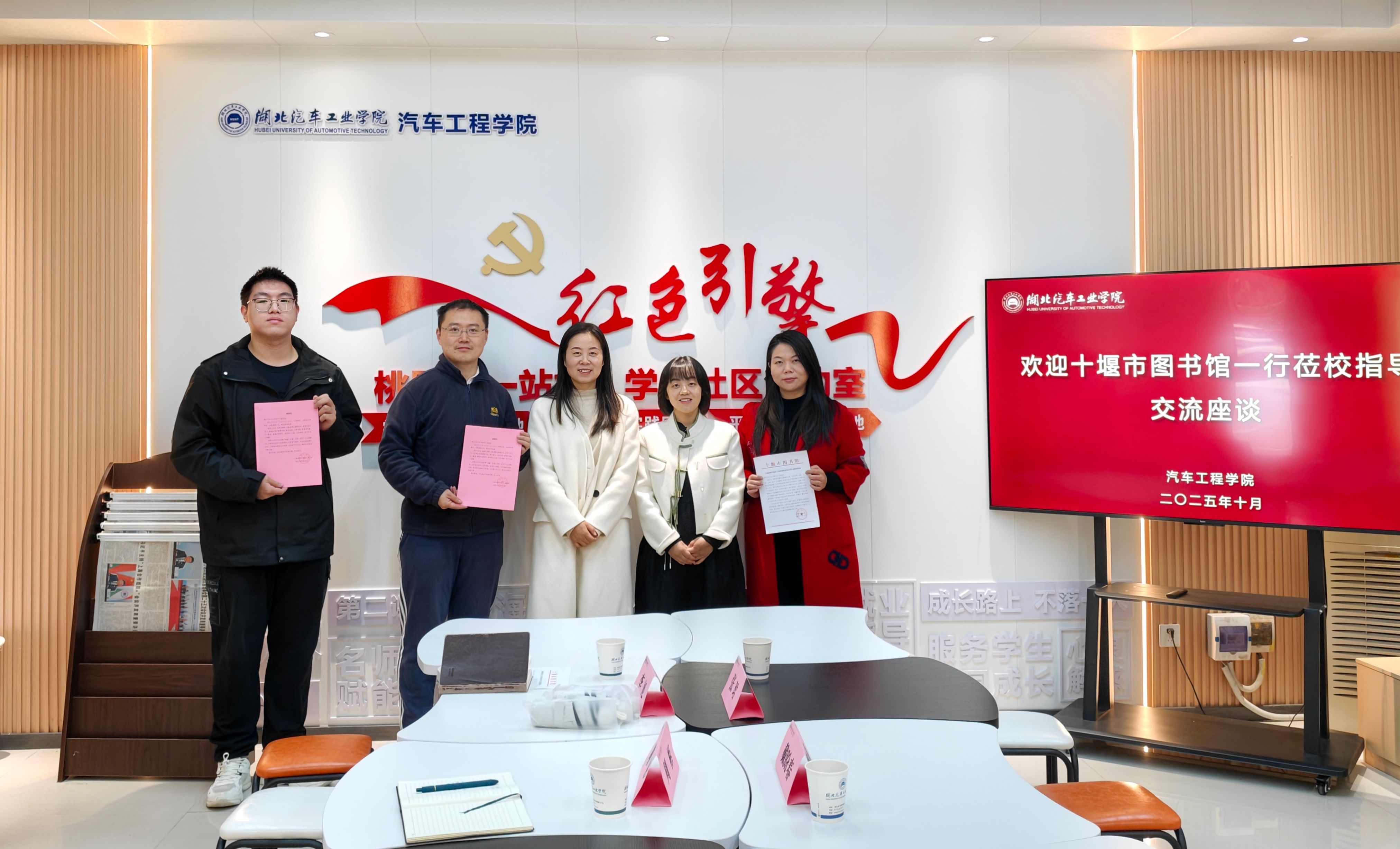 10月23日上午,十堰市图书馆少儿部戴盼春、张珺老师莅临学院进行座谈交流,学院党委副书记周彬、校团委实践与社团工作部主任李旭、学院团委书记李键雯及志愿者学生代表徐翔共同参加此次座谈会。