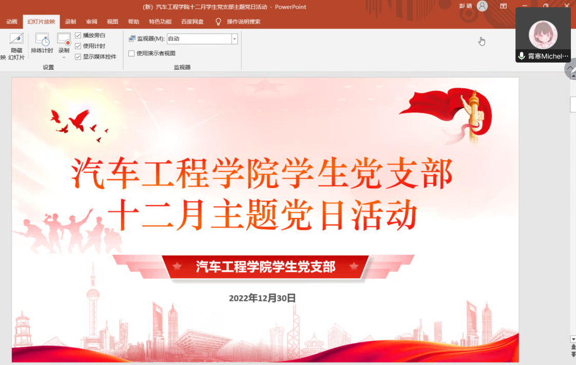 学生党支部通过线上会议召开了12月份主题党日活动。学生党支部书记胡霄寒、全体学生党员参加了此次活动,学生党员张昕宇主持会议。