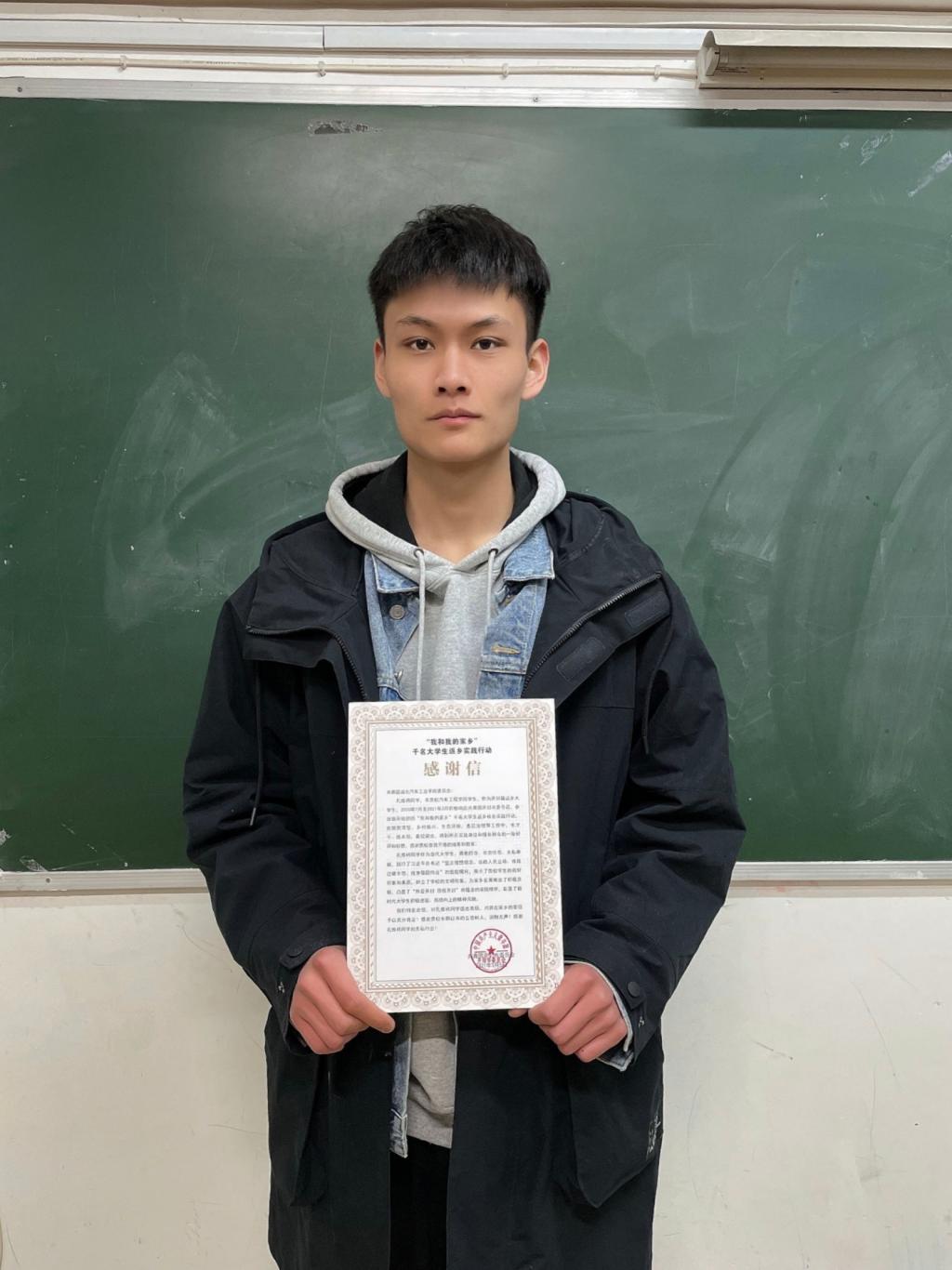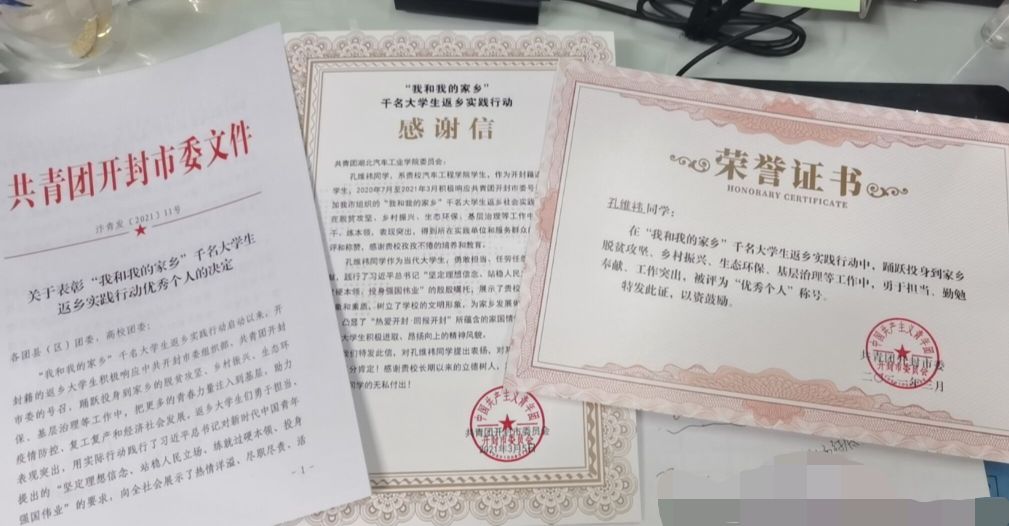 收到了来自河南省开封市团委寄来的表彰文件、荣誉证书和感谢信,对学院车辆193班孔维祎同学在当地“我和我的家乡”大学生返乡实践活动中的突出表现给予了高度肯定,评为“先进个人”。