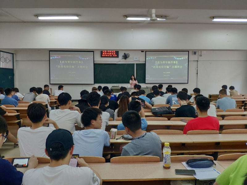 在5202教室开展了防范电信诈骗安全主题班会,分党委副书记杜昕俊、学工办主任胡霄寒,各年级班长、团员代表100余人参加此次活动。