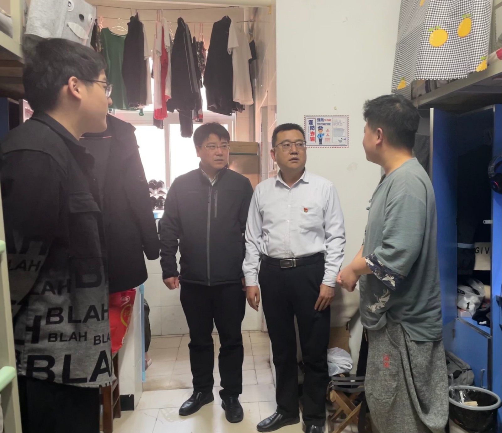 在李四北毕业生宿舍的走访过程中,胡明茂、杨亚会与大四学生们亲切地交谈,重点关注了毕业设计进度以及毕业论文撰写中遇到的实际困难。认真询问了他们的就业去向,深入了解每一位同学的就业、考研情况,并提醒未就业的同学密切关注学院及企业发布的招聘信息,积极就业,树立正确的就业观,谨防就业陷阱。随后,在李五B新生宿舍走访时,重点了解了大一学生的思想、学习与生活情况,胡明茂强调说到:“大家要勤奋学习、打牢基础,主动了解掌握学科前沿和学术动态,做好学业规划,合理分配时间,积极参加学科竞赛,不断提升专业素养和创新实践能力。也要保持宿舍卫生干净整洁,养成良好生活习惯,做高素质的车院青年。”同时,杨亚会也反复叮嘱大家:“五一假期务必把安全放在第一位,无论是出行还是留校,都要时刻紧绷安全弦,特别要谨防电信网络诈骗。”