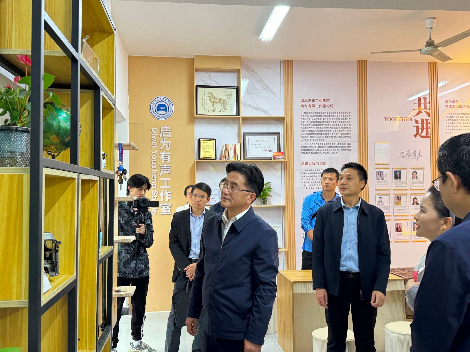 “‘启’字意味着启迪和启发,‘为’字强调行动和实践,‘有声’一词象征着辅导员工作的影响力和成效……”工作室主持人胡霄寒从名称释义、成员构成、建设基础、育人成果、发展规划等方面进行了详细汇报,并结合辅导员九大职能阐释了工作室构建“五维协同五力共融”大思政工作机制的建设思路,引导参观了学院“启为创新非遗文化保护中心”的文化藏品墙,以及用来展示各地校友会、校友企业捐赠的汽车模型的校友文化窗,重点介绍了精心设计打造的“心屿空间”心灵驿站。