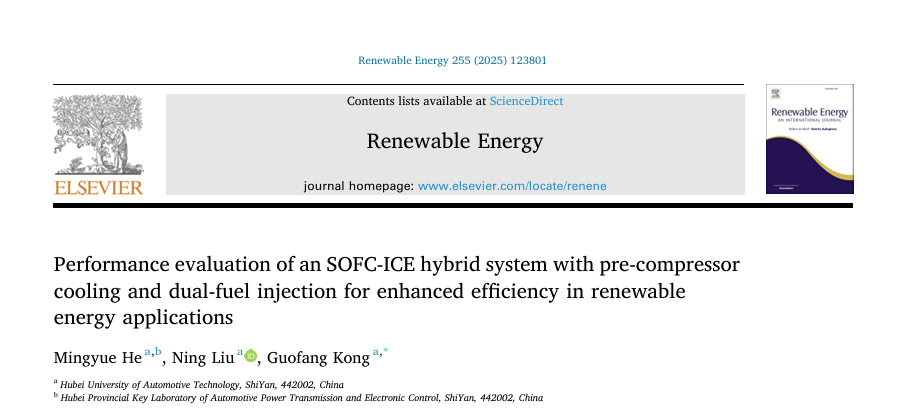 本网讯(文/ 刘宁)近日,麻豆在线 在绿色可持续发展技术研究中取得新进展。2024专业型硕士研究生刘宁,在湖北省汽车动力传动与电子控制重点实验室赫明月博士的悉心指导下,以第一学生作者身份在国际工程技术领域顶级期刊《RENEWABLE ENERGY》(中科院一区TOP期刊,影响因子IF=9.0)发表研究论文,题目为“Performance evaluation of an SOFC-ICE hybrid system with pre-compressor cooling and dual-fuel injection for enhanced efficiency in renewable energy applications”。
