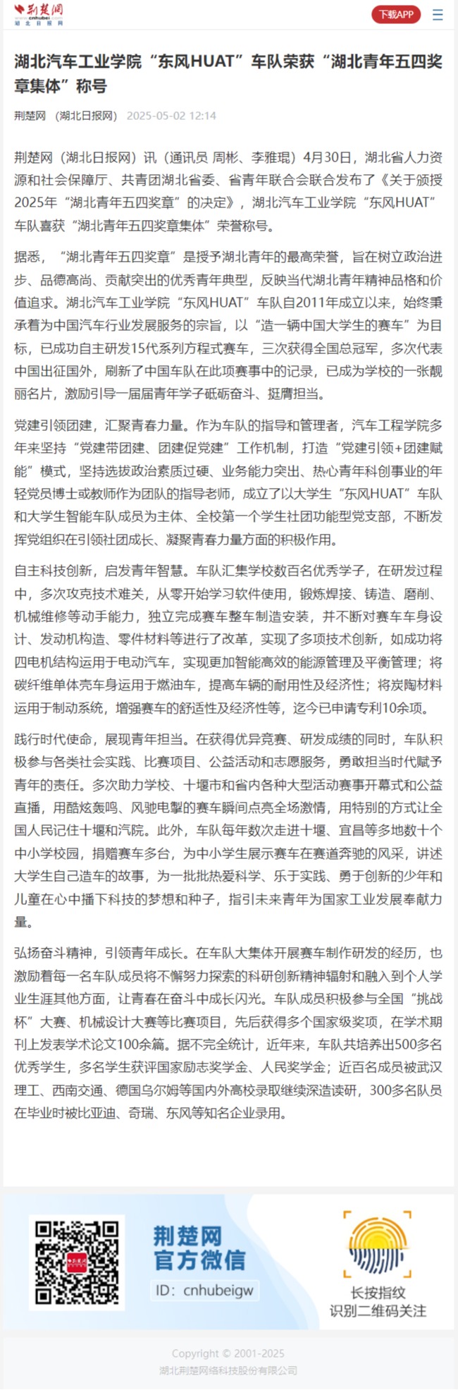 【荆楚网】麻豆在线 “东风HUAT”车队荣获“湖北青年五四奖章集体”称号