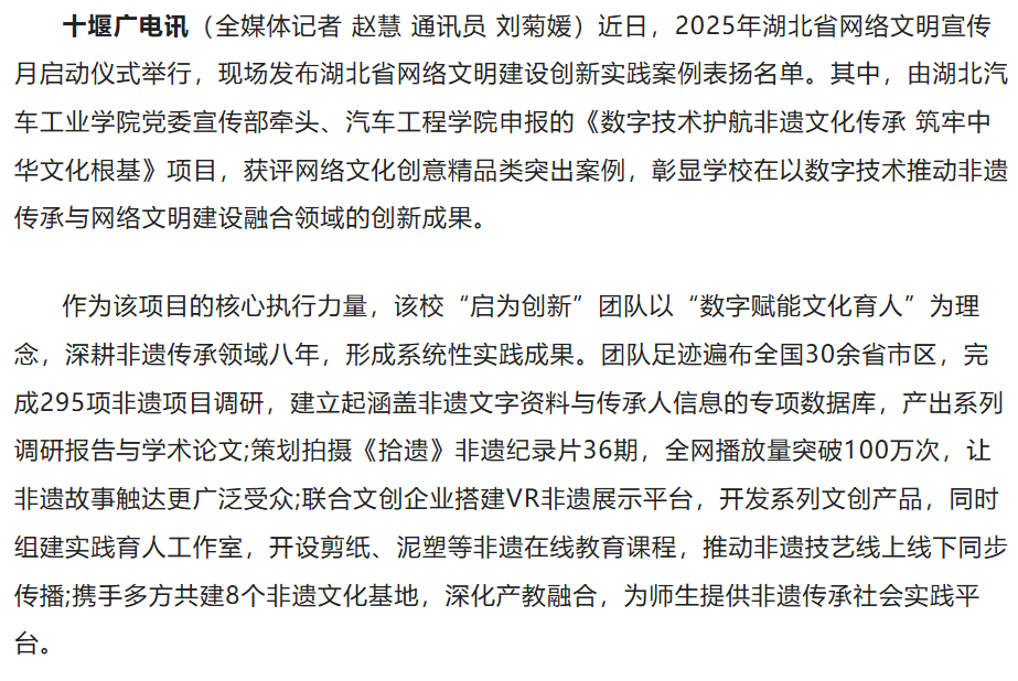 【十堰广电】数字护航非遗!麻豆在线 项目入选省级网络文明建设创新案例