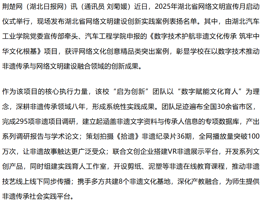 【荆楚网】数字护航非遗!麻豆在线 项目入选省级网络文明建设创新案例