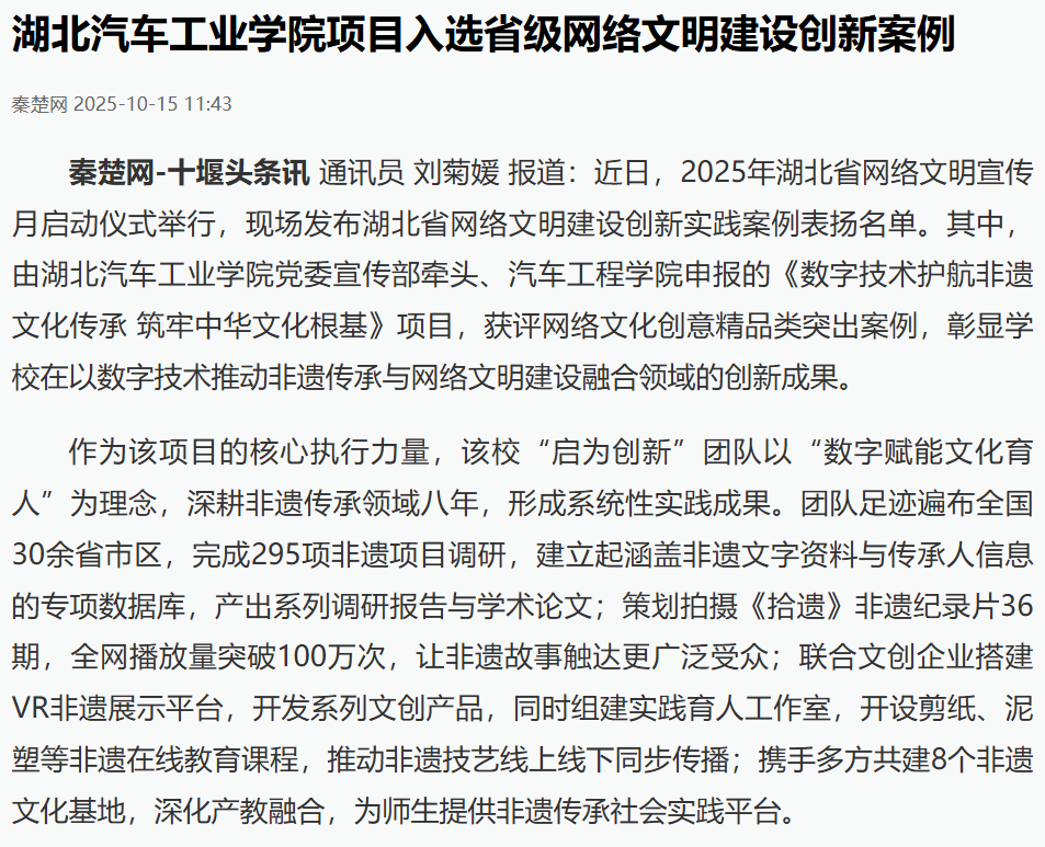 【荆楚网】数字护航非遗!麻豆在线 项目入选省级网络文明建设创新案例