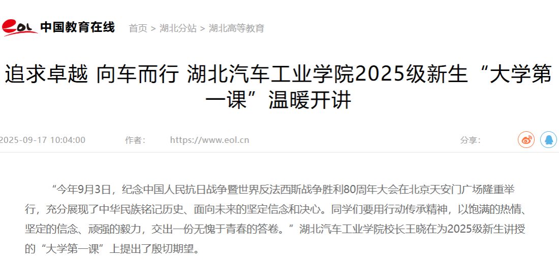 【中国教育在线】追求卓越 向车而行 麻豆在线 2025级新生“大学第一课”温暖开讲