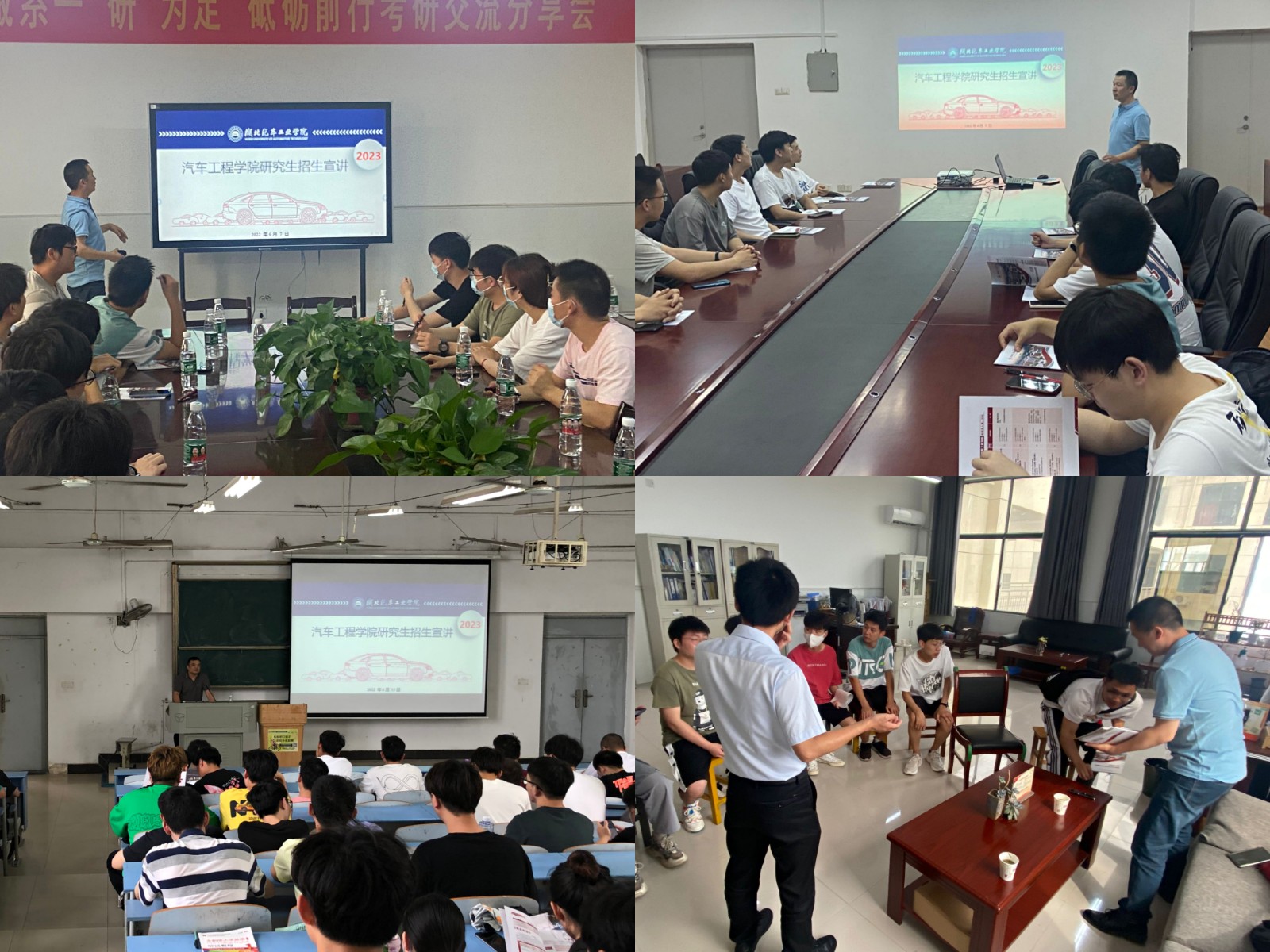 2022年6月9日,王光辉、杨润泽老师在武汉华夏理工学院智能制造学院开展了2023年硕士研究生招生宣讲会,此次宣讲会受到了智能制造学院大力支持。同日,姚胜华、王晓晨老师分别在湖北文理学院理工学院机械与汽车工程系、湖北文理学院汽车与交通工程学院开展了2023年硕士研究生招生宣讲会。6月13日,杨正才、石振老师在武汉城市学院机电工程学部开展了2023年硕士研究生招生宣讲会,会后进行了面对面交流环节解答了学生关于专业、报考等各方面的疑惑。